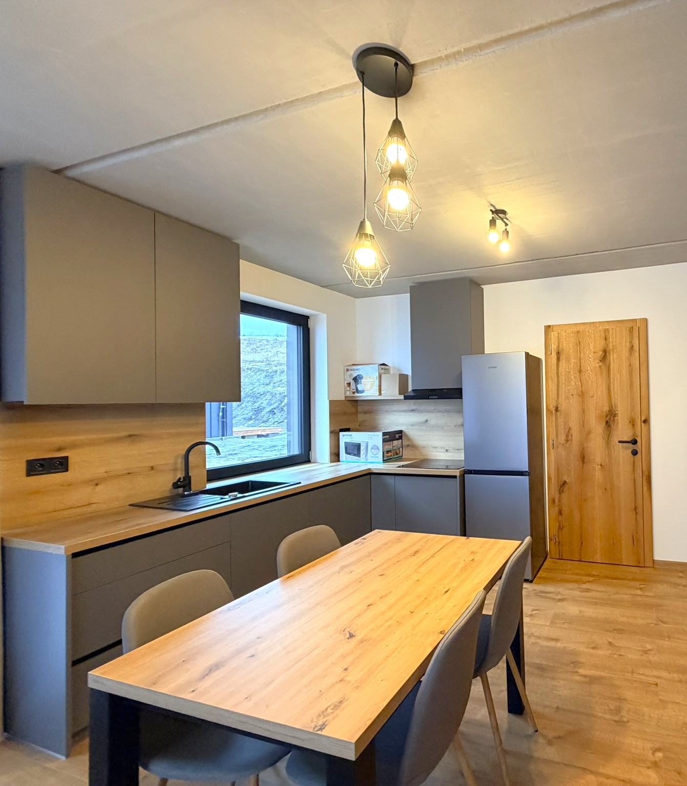 – Kuchynská linka so spotrebičmi (varná doska, digestor, mikrovlnka, chladnička, kávovar)
